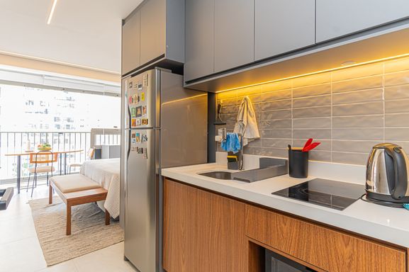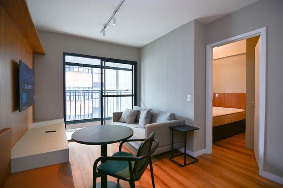 Studio novo, mobiliado, em prédio moderno, com infraestrutura diferenciada! São ótimos 34 m2 para você mudar já! Um belo dormitório com armário espelhado, integrado com cozinha, já com micro-ondas e muitos armários, sala com rack e TV e sacada. A sacada já conta com fechamento de vidro e uma pia com gabinete. Os espaços são servidos por um bom banheiro, com box e armário na pia. A iluminação é projetada, em estilo moderno e acolhedor. O Prédio é novo e oferece excelente infraestrutura, para você não depender de nada de fora: bar com lounge no rooftop, bicicletário, churrasqueira, coworking, espaço para receber deliveries, espaço gourmet, fitness no rooftop, lavanderia, pet place, piscina com solarium no rooftop, redário, sala de massagem, sauna e salão de festas. A localização é ótima, em Cerqueira César, a três quadras do Metro Sumaré. Fácil acesso às importantes vias da região, Av. Sumaré, Av. Dr. Arnaldo, Av. Pacaembu e daí para as Marginais e vias centrais. Próximo às principais comodidades da região – Shopping Bourbon, Allianz Parque, Pacaembu, Parque da Água Branca, Centro Universitário Sumaré, Hospital das Clínicas, PUC-SP, Escolas, uma ampla variedade de Restaurantes, além de diversos Bares e Pizzarias, e muito mais! Vale a pena conhecer!