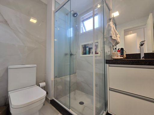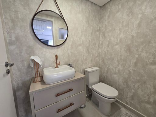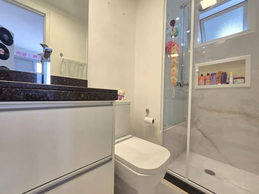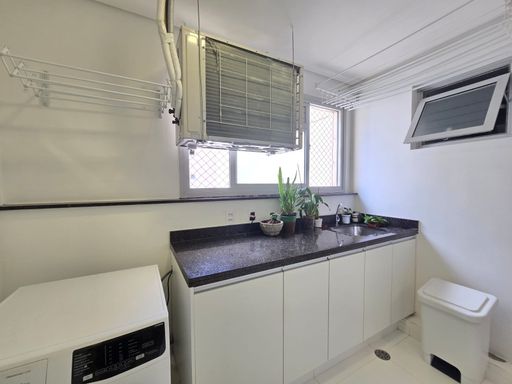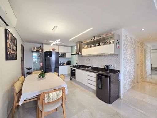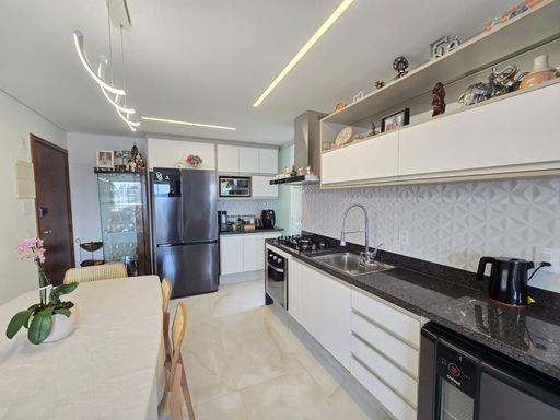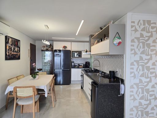 Possui duas suítes espaçosas, ambas com ótima iluminação e ventilação natural, além de um lavabo elegante que atende à área social. A cozinha planejada é funcional e integrada à área de serviço, que também é ampla, bem ventilada e equipada com armários, oferecendo conforto e muita praticidade no dia a dia.