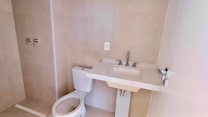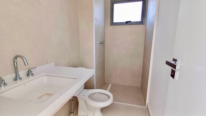 Banheiros com cuba esculpida e revestimentos claros, que ampliam o ambiente;