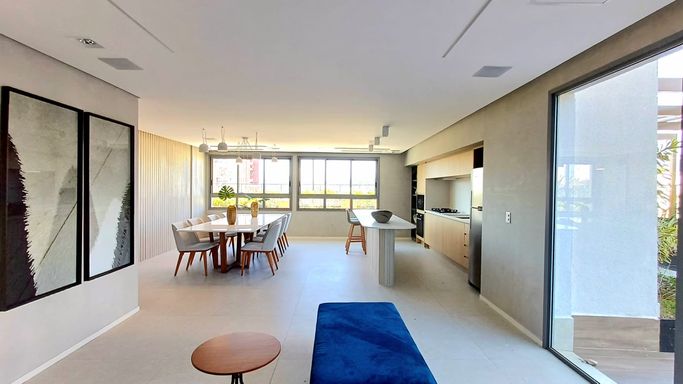 Sala ampla com integração à varanda, ideal para momentos de lazer e refeições ao ar livre;