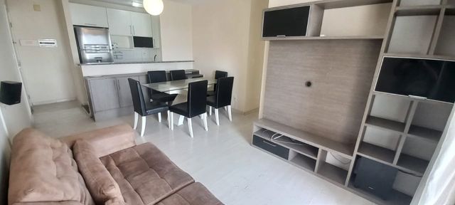 A sala ampla com sofá, rack estante, armários embutidos sala com 02 ambientes, cozinha com bastante armários, geladeira, fogão e maquina de lavar e secar.
