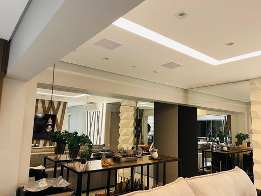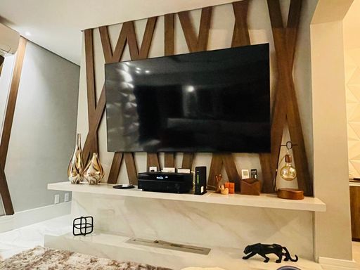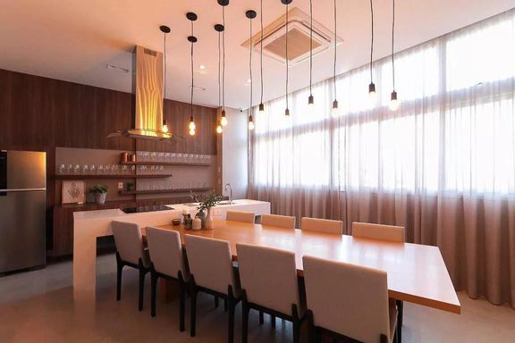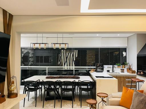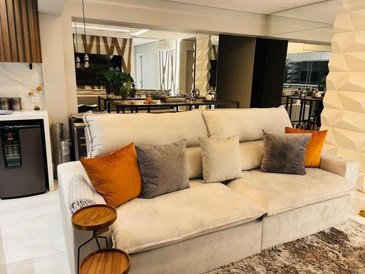 O imóvel possui 117 m² de área privativa, com planta bem distribuída e ambientes integrados. A sala ampla para dois ambientes se conecta à varanda gourmet com churrasqueira, fechamento em vidro e piso nivelado, proporcionando um espaço ideal para convivência e lazer. O apartamento conta ainda com piso em porcelanato, projeto de iluminação e ar-condicionado.