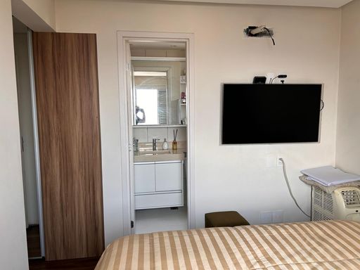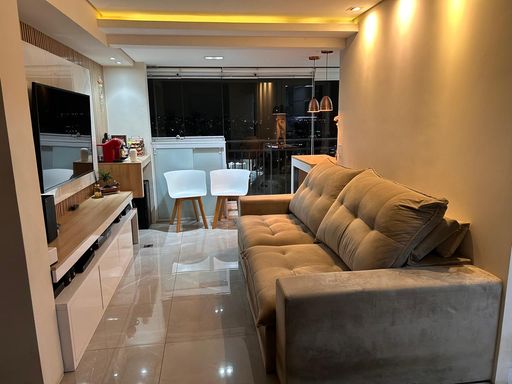 O condomínio oferece uma estrutura completa de lazer, incluindo academia equipada, piscina externa e piscina interna aquecida, sauna, brinquedoteca, salão de jogos, quadra poliesportiva, salão de festas e espaço gourmet. As fotos revelam ambientes modernos, aconchegantes e mobiliados, com sala de estar bem decorada, sofás confortáveis, varanda espaçosa, banheiros já prontos com armários e espelhos, além de cozinha com armários planejados.