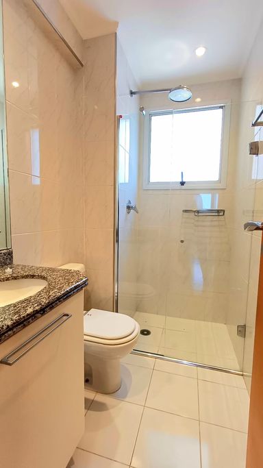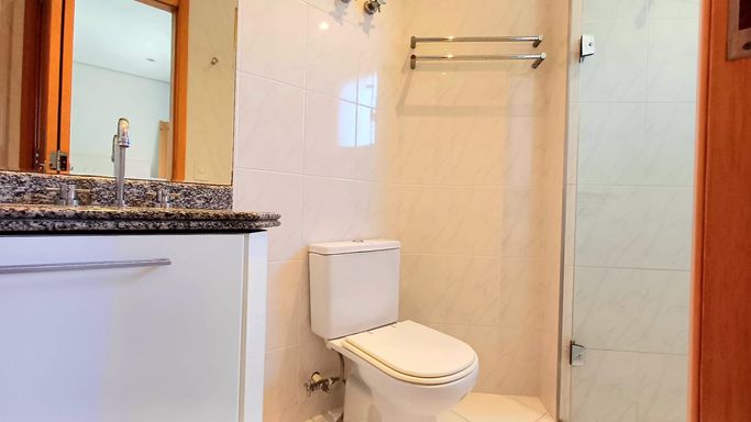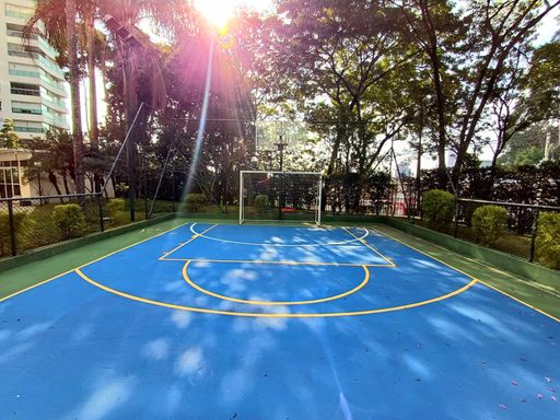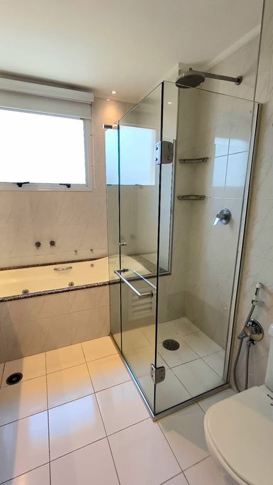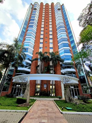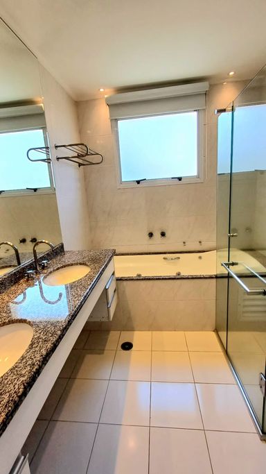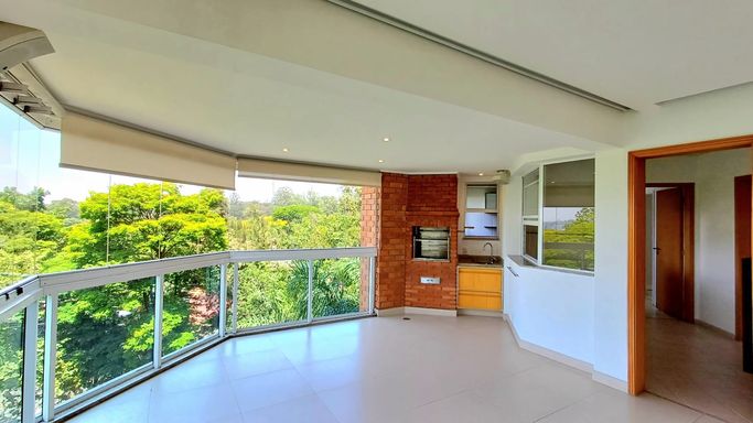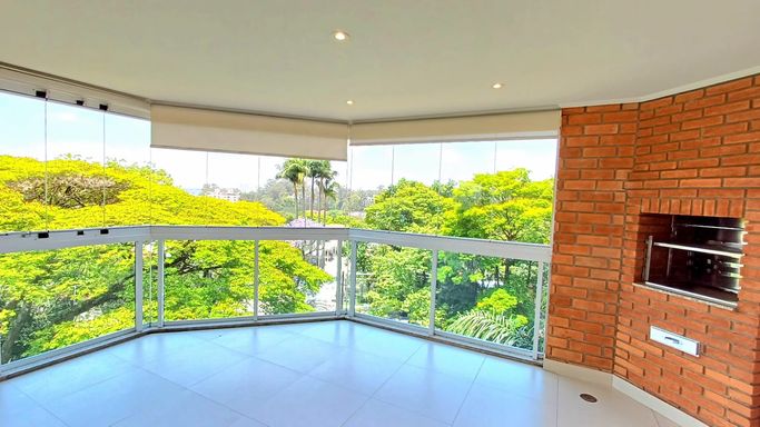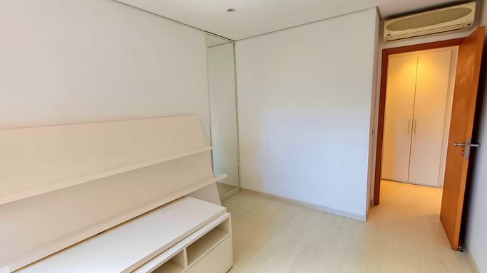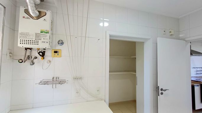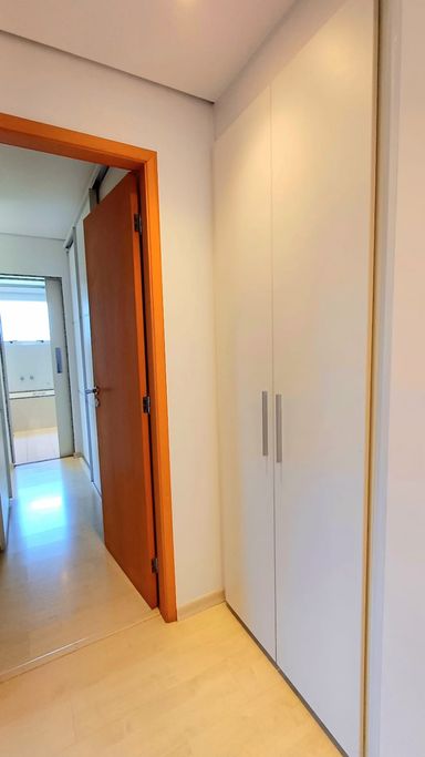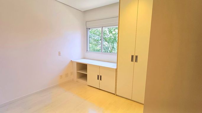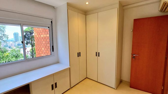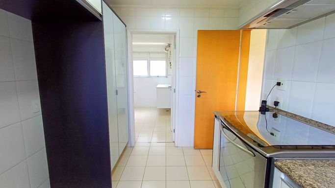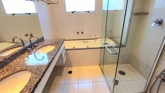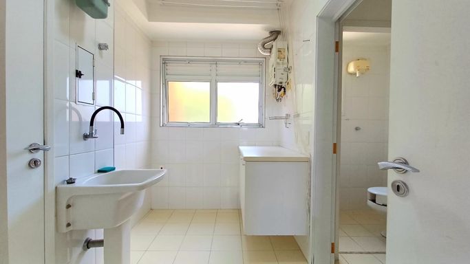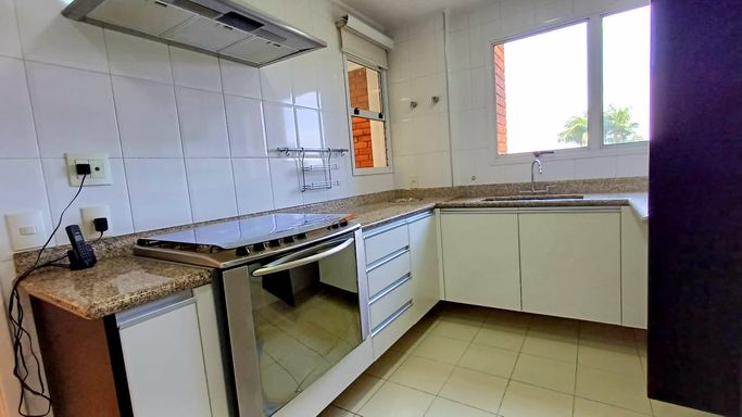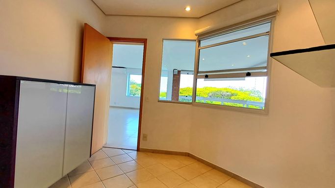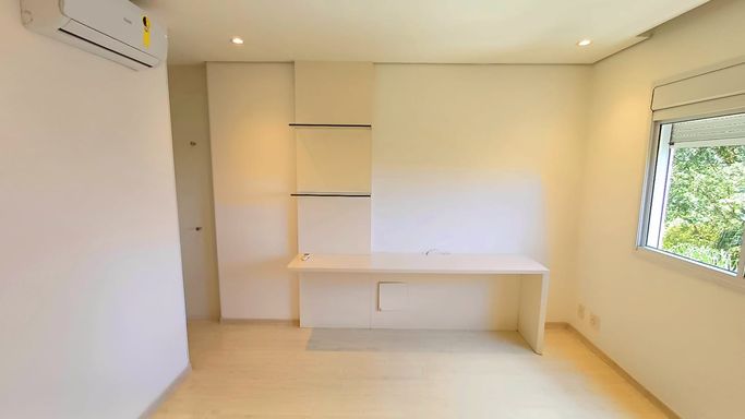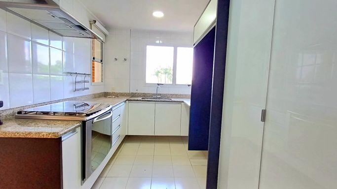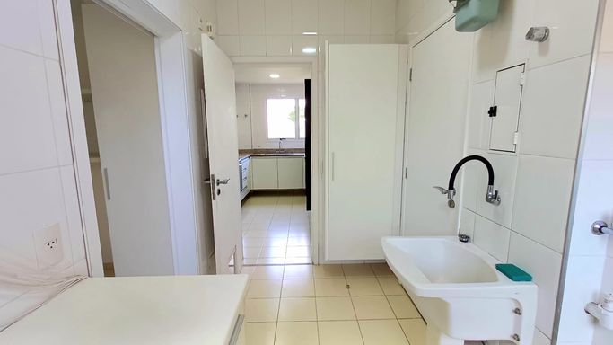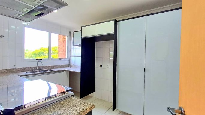 São três suítes com móveis planejados, e ar condicionado, sendo a suíte master com closet, oferecendo conforto e organização. A copa e cozinha são ricas em armários planejados, complementando a área de serviço com planejados, banheiro para funcionária e entrada de serviço, garantindo praticidade no dia a dia. O imóvel dispõe de quatro vagas de garagem fixas e depósito para maior comodidade.
