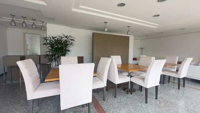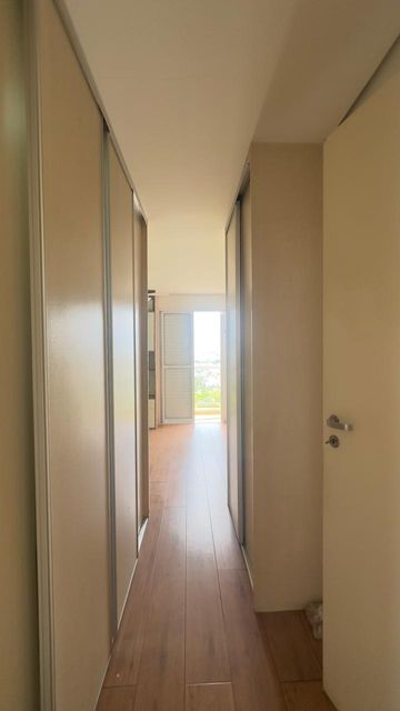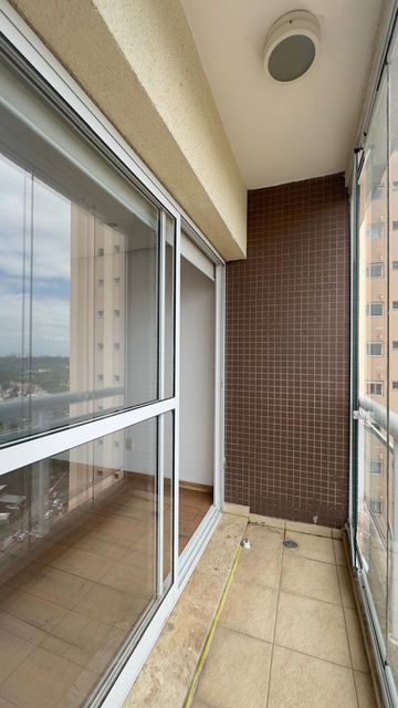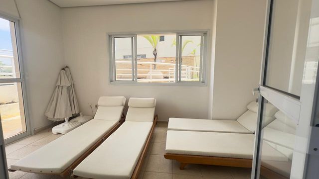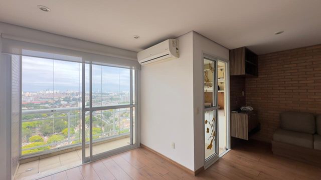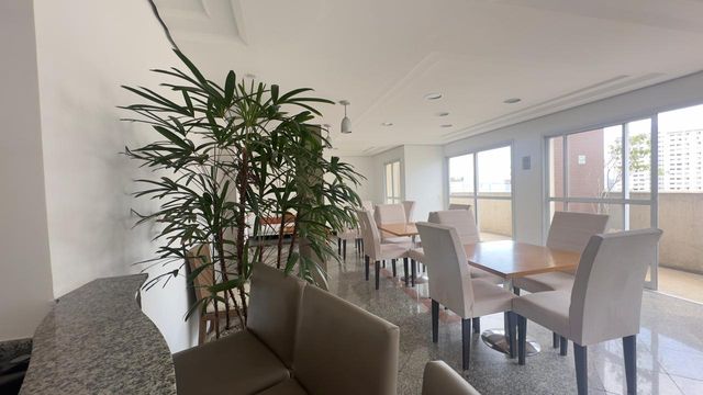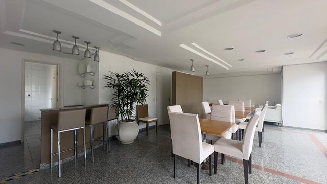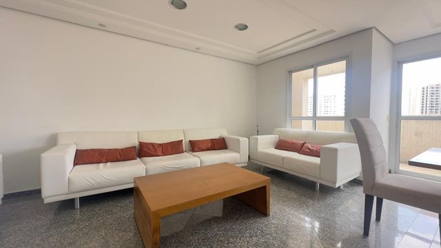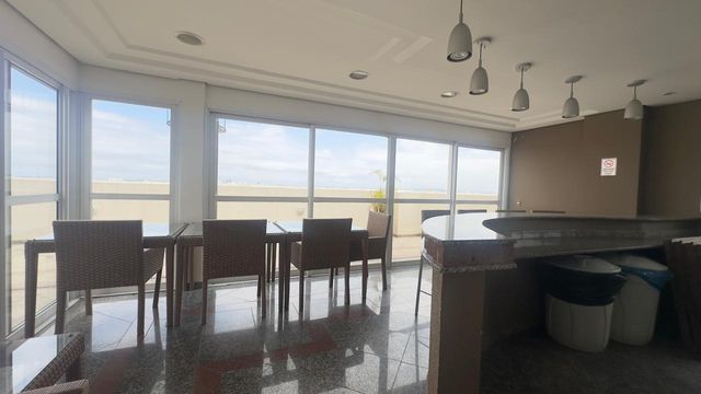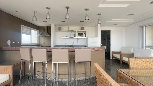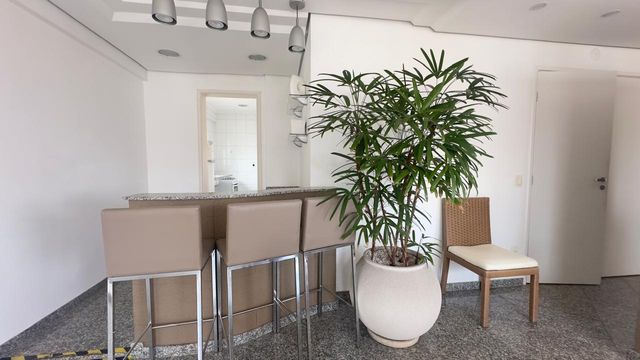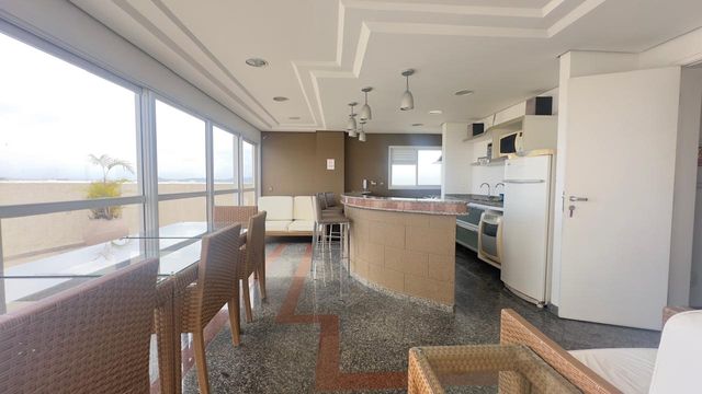 A sala é grande, equipada com ar-condicionado, integrada com a cozinha estilo americana, servida por agradável varanda que atende a sala e os dormitórios, além de um prático escritório.