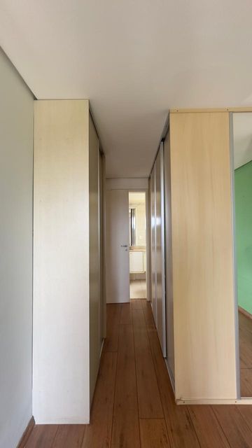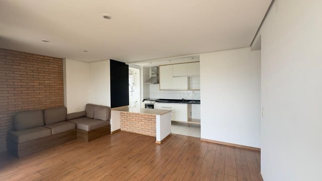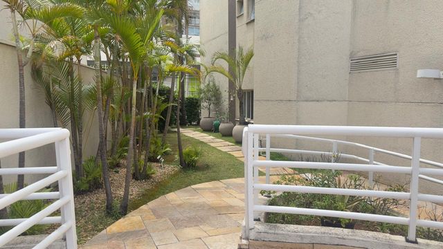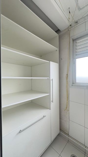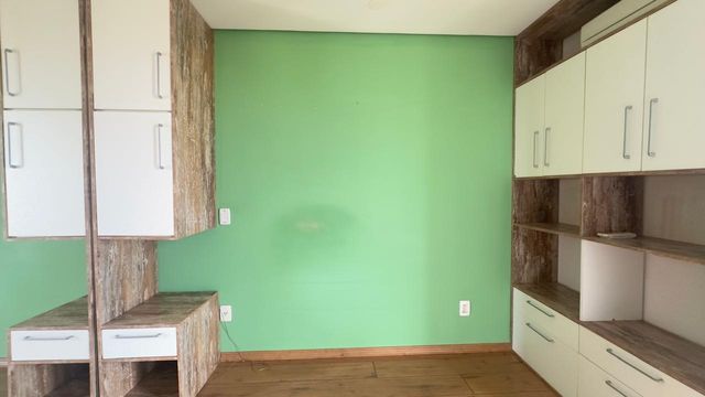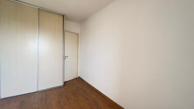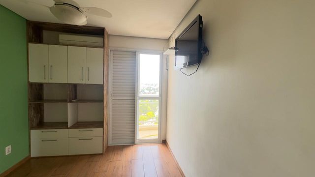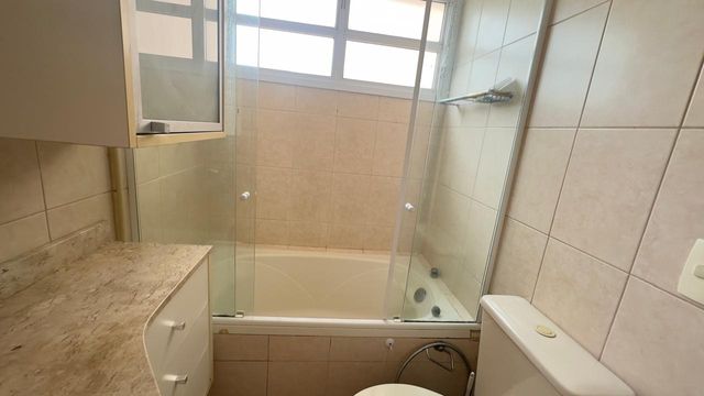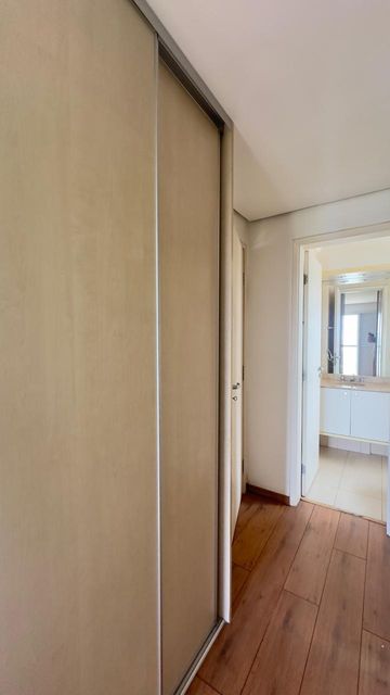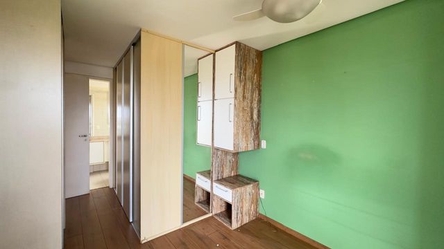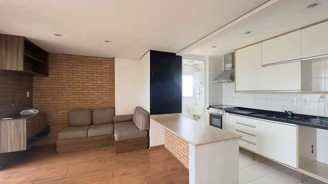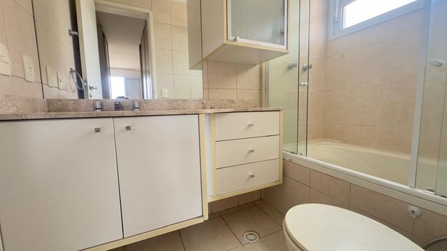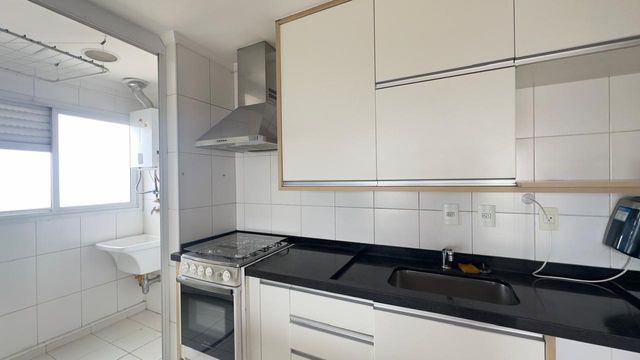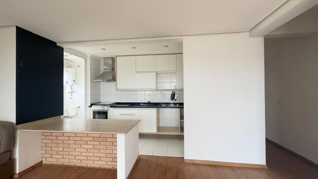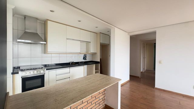 A suíte principal conta com ar-condicionado e um bom banheiro com banheira. Um dormitório e o banheiro de serviço complementam a área social. A área de serviço tem acesso direto pela cozinha, que está equipada ótimos armários, fogão e coifa. O apartamento conta com 2 vagas.