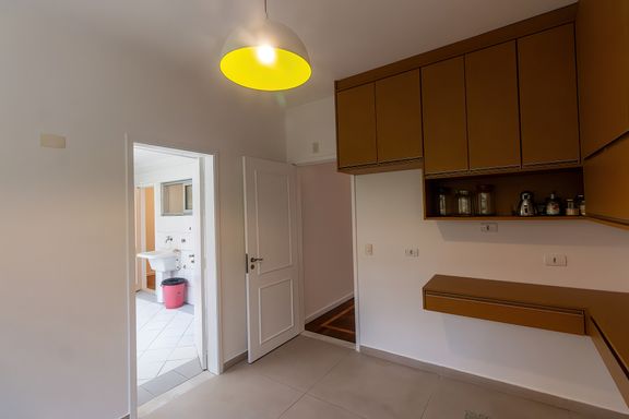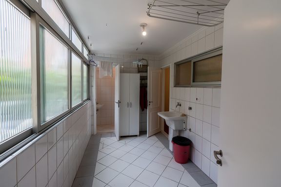 A cozinha é espaçosa, equipada com armários, e integrada à área de serviço, que conta ainda com quarto e banheiro de apoio, um diferencial cada vez mais valorizado, seja para organização, apoio doméstico ou uso funcional no dia a dia. O imóvel possui aquecimento de água a gás.