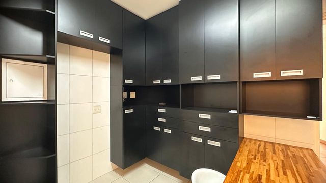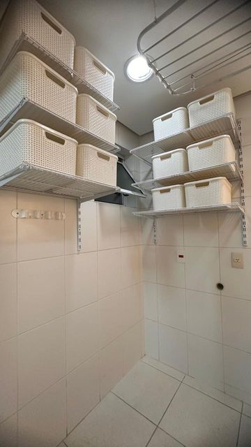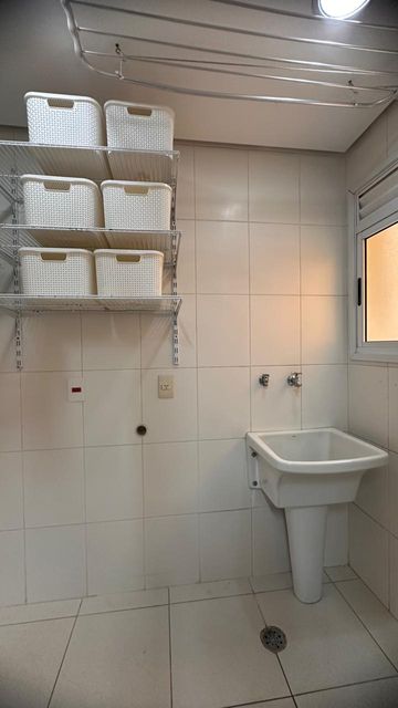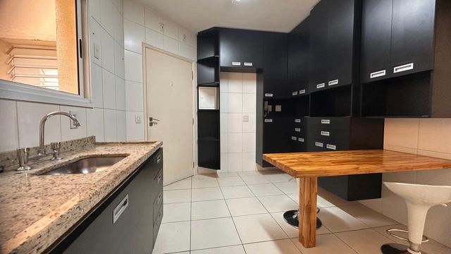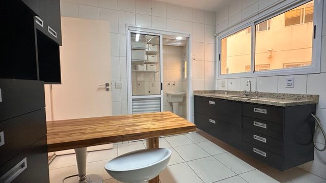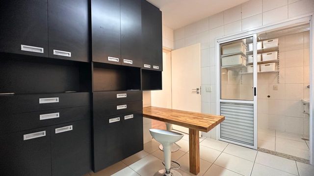 A cozinha é funcional e bem iluminada, com ótima marcenaria, integrada à lavanderia, que também dispõe de armários, garantindo praticidade no dia a dia.
