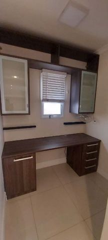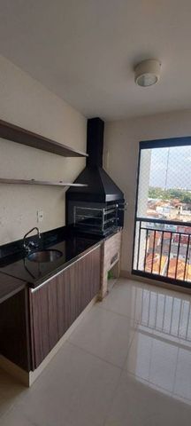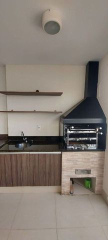 A sala para dois ambientes é espaçosa e integrada à varanda gourmet, fechada com vidro e tela de proteção, equipada com pia e gabinete — ideal para receber amigos e familiares. A cozinha integrada é funcional e moderna, com bancada revestida em pastilhas, cooktop embutido, coifa em inox e armários aéreos, além de lavanderia bem ventilada.