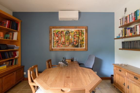 Embora a casa conte com ar-condicionado, foram aplicadas técnicas e tecnologias da construção britânica, garantindo conforto térmico tanto no inverno quanto no verão, com reduzida necessidade de climatização.