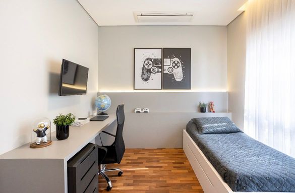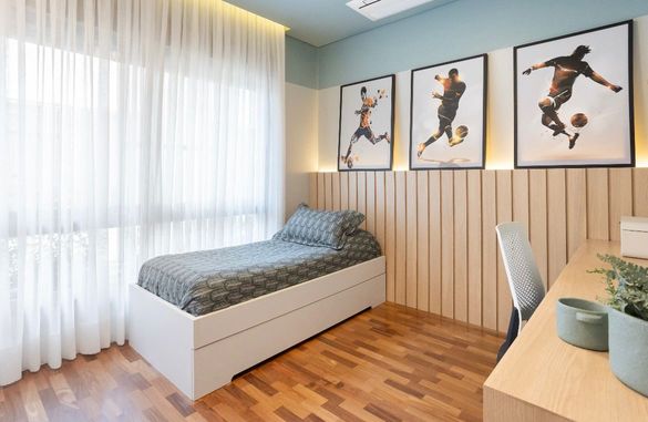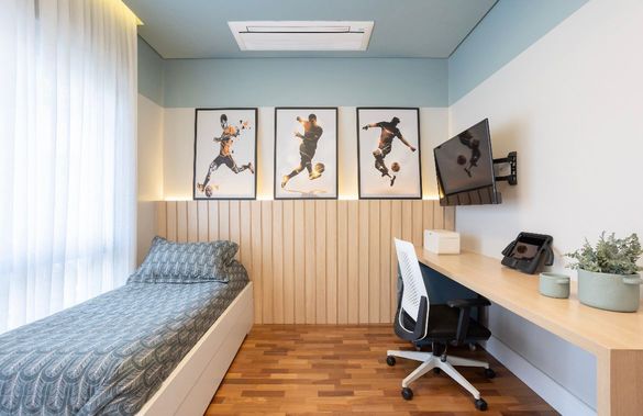 A área íntima, no segundo piso, foi cuidadosamente planejada para garantir conforto e privacidade, com duas suítes e dois dormitórios com banheiro compartilhado, todos climatizados. Algumas suítes contam com varanda voltada para a praça, proporcionando uma vista agradável e uma atmosfera tranquila.