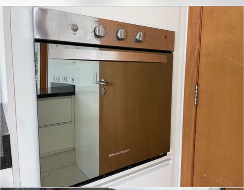 Cozinha americana funcional, com armários planejados e fogão incluso, ideal para refeições rápidas