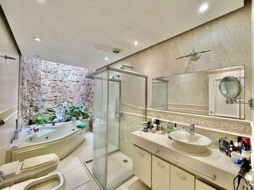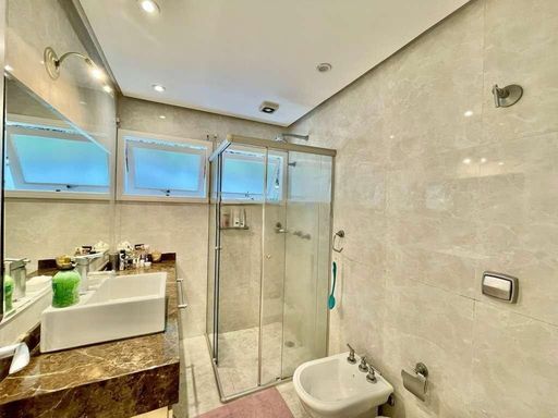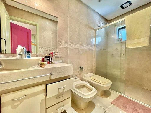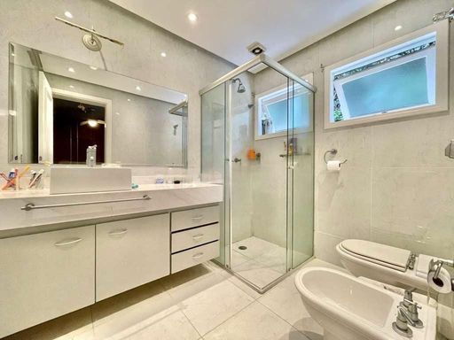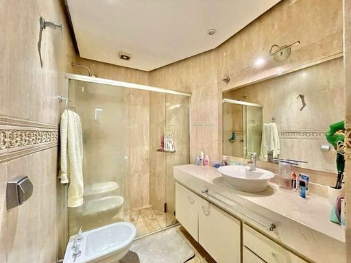 Banheiros com tampos em mármore, espelhos, gabinetes, bidê e box de vidro