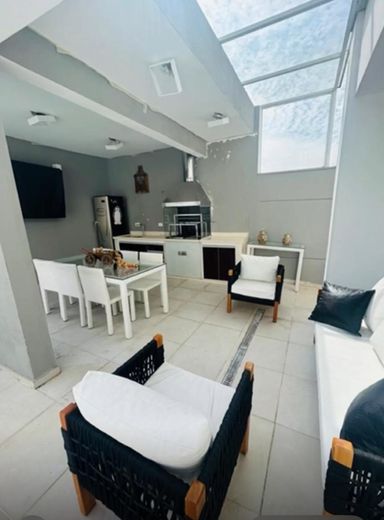 A residência conta com mezanino, sala de lareira, sala de jantar, sala de estar, lavabo, cozinha americana, despensa, área de serviço e quarto de empregada com banheiro. Além disso, possui um espaço gourmet com churrasqueira e piscina.