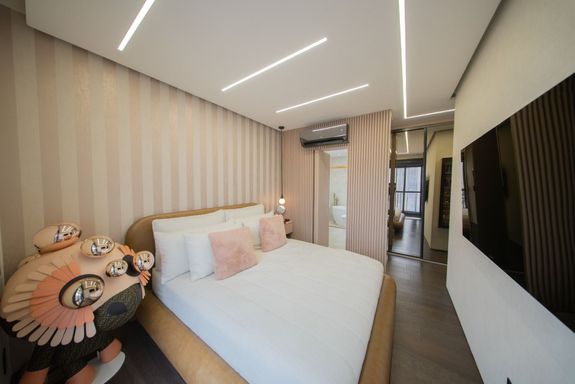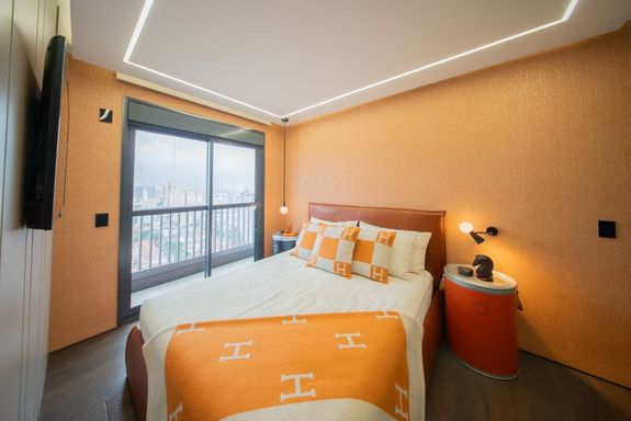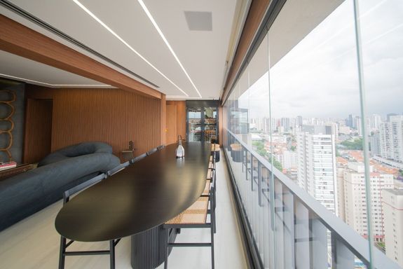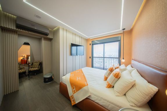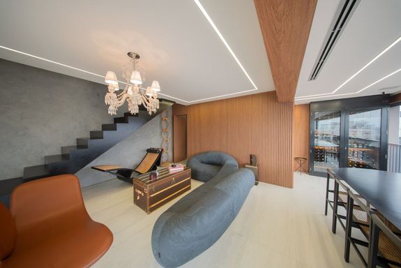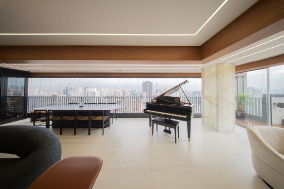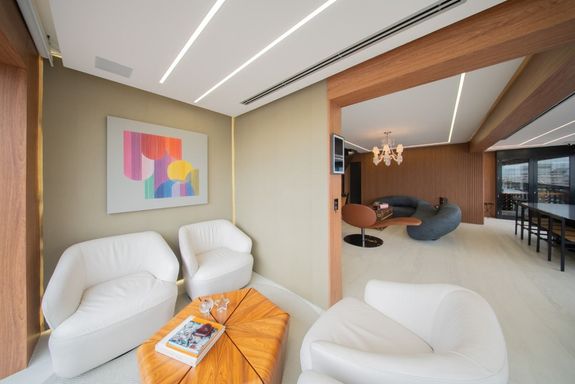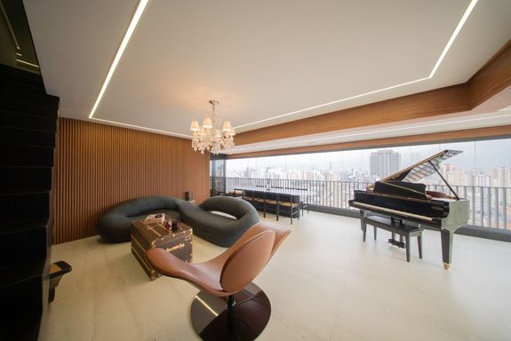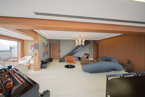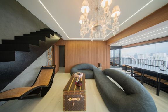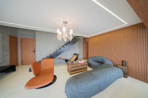 O living revela uma curadoria impecável: o sofá Infinito, da Natuzzi, premiado internacionalmente, divide a cena com a icônica cadeira de balanço de Oscar Niemeyer. A mesa Pétala, de Jorge Zalszupin, dialoga com a imponência do lustre Baccarat, criando um ambiente que une arte, design e personalidade. Elementos de Louis Vuitton, Gucci e Hermès complementam a atmosfera sofisticada.