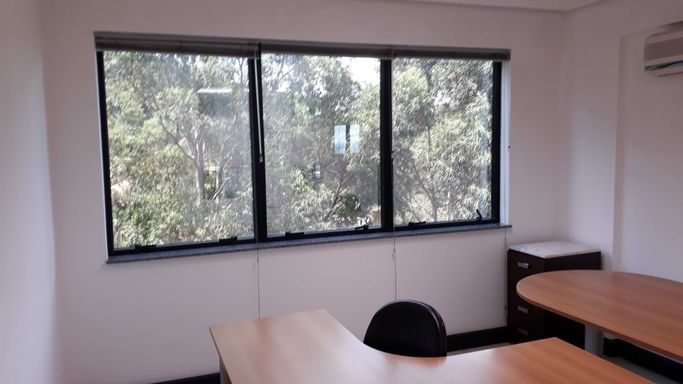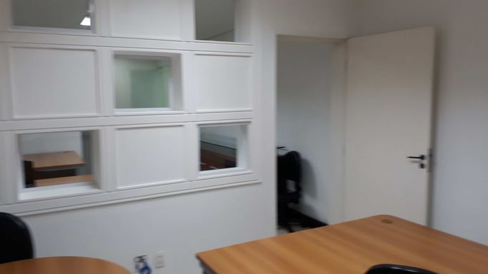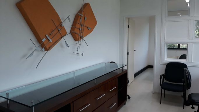 Já está parcialmente equipada para escritório, com divisória formando uma sala de Diretoria. A sala conta com um banheiro próprio e uma boa copa. A sala possui ampla área envidraçada que contribui para uma ótima luminosidade.