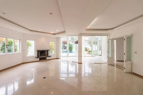 Sala de estar com pé-direito alto e grandes aberturas para o jardim