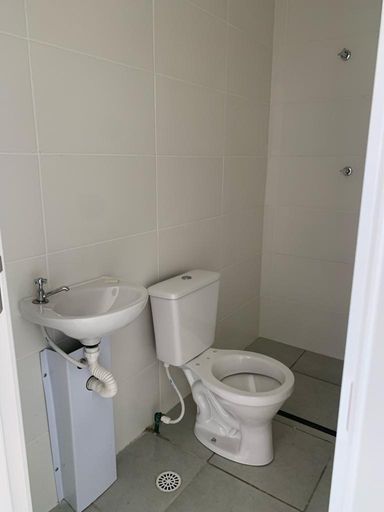 • Banheiro com acabamento em porcelanato, box de vidro e bancada de apoio