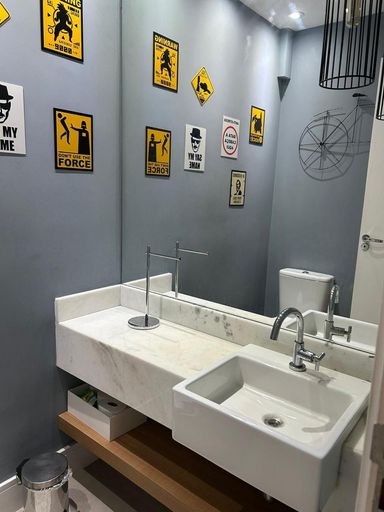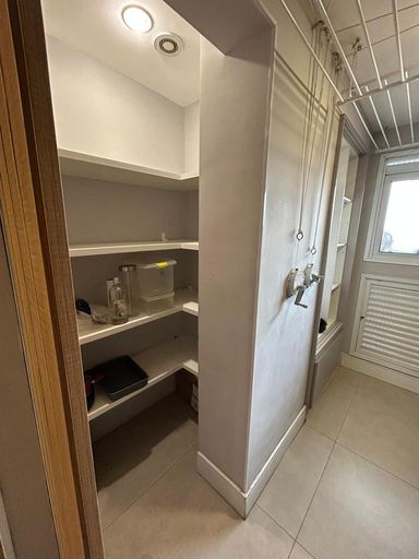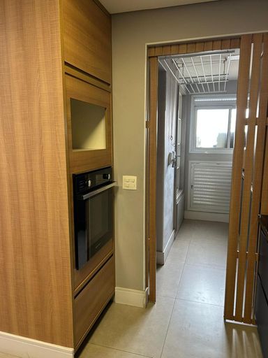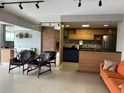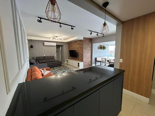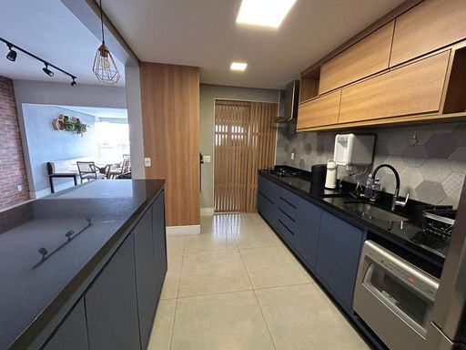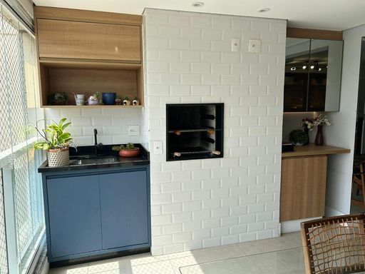 A suíte conta com amplo armário, ar-condicionado e, como os demais dormitórios, tem acesso à gostosa varanda. O banheiro da área íntima é muito bem decorado. Cozinha ampla, moderna, estilo americana, que se integra totalmente ao ambiente, repleta de armários altos e baixos, com cooktop e coifa, acesso à área de serviço, equipada com bela bancada e armário, e janelas que garantem ventilação e luminosidade, além de uma útil despensa. O apartamento tem 2 vagas privativas e depósito.