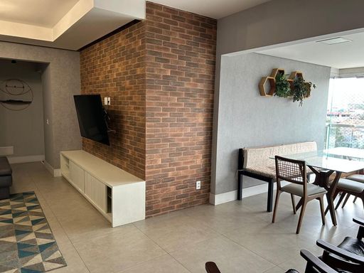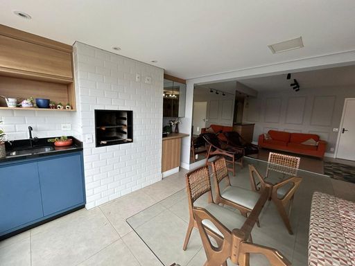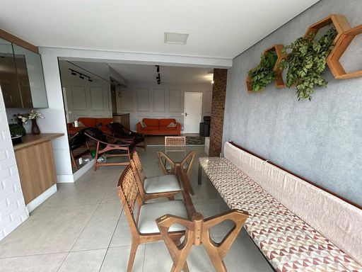 Sala grande, com 3 ambientes, ar-condicionado, integrada à charmosa varanda gourmet com churrasqueira, pia e armário, e com fechamento de vidro e tela. Toda área social em cerâmica de ótima qualidade, servida por um belo lavabo e área íntima em piso de madeira.