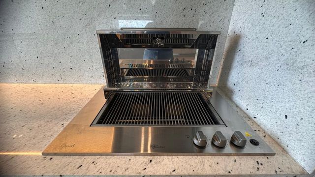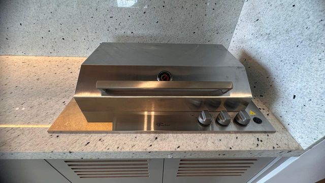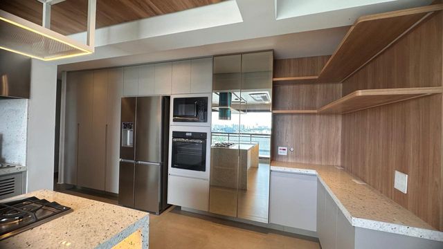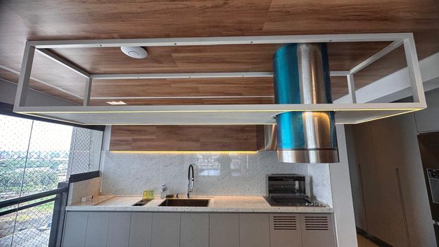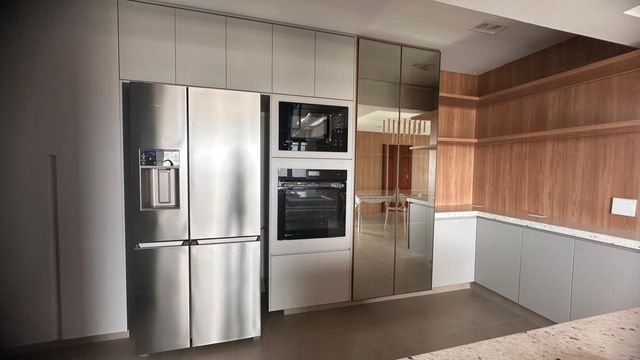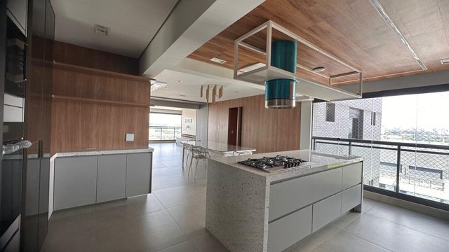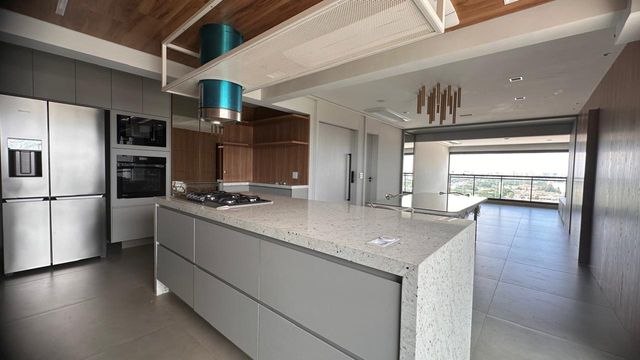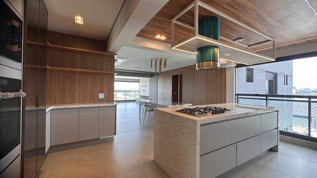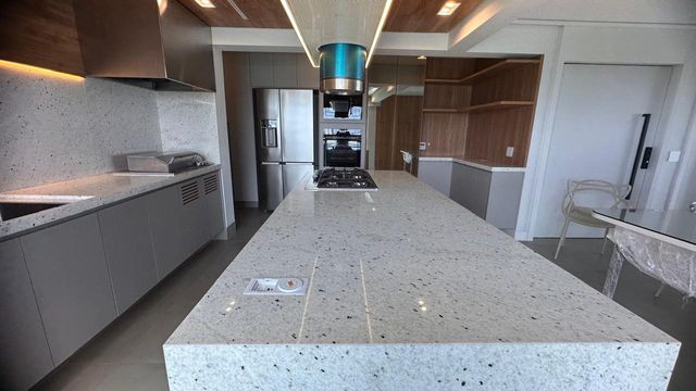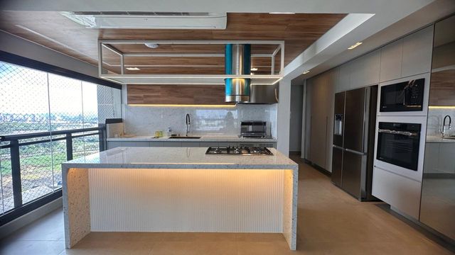 A cozinha, totalmente integrada, assume protagonismo no ambiente. Com ilha central completa, eletros de alto padrão e churrasqueira a gás, ela convida a momentos compartilhados — seja em encontros descontraídos ou ocasiões especiais.