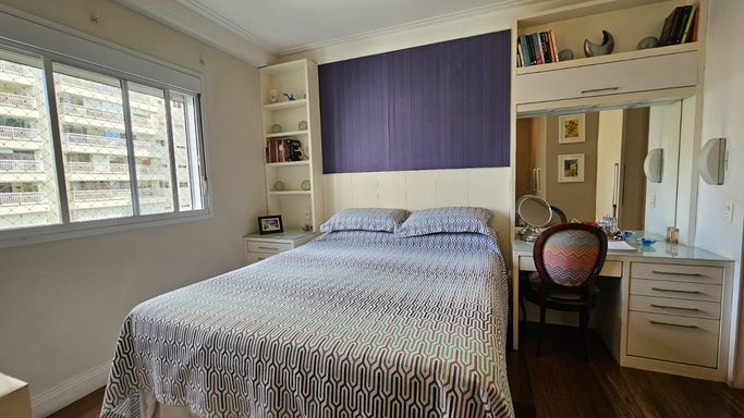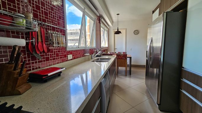 Apartamento com boa distribuição interna, ar-condicionado em vários ambientes, sala em L, lavabo, iluminação dirigida e varanda gourmet com churrasqueira, pia, armário e fechamento de vidro. Com 4 quartos, sendo duas suítes, a suíte master com Jacuzzi, banho social decorado, um dormitório adaptado para escritório, mais um dormitório que aceita reversão para suíte, toda área social em piso de madeira. Cozinha grande, espaço para geladeira duplex, copa e com acesso à entrada de serviço e lavanderia.