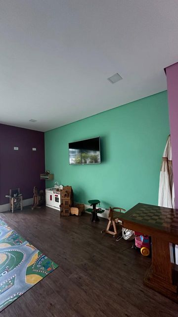 O imóvel oferece uma espaçosa sala para dois ambientes, com acabamento em gesso e iluminação direcionada, além de um elegante lavabo que complementa a área social.
