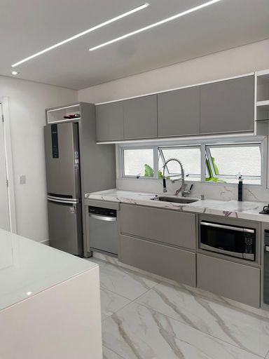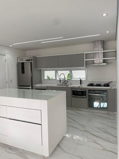 •	Cozinha moderna integrada à sala de jantar e sala de estar