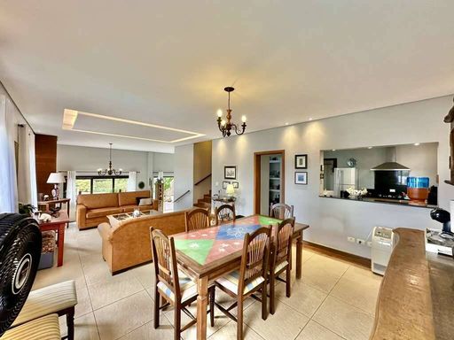 • Cozinha integrada à sala de jantar, repleta de armários e equipada com forno embutido e exaustor